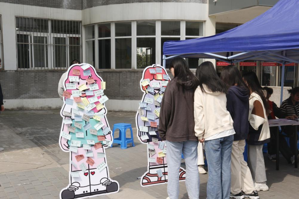 活动现场学院心理协会准备了两个人形立牌,贴满了由便利贴做成的各种“标签”,代表着社会中对男性、女性不同的性格标签、气质标签、刻板印象标签及带有社会规训的话语标签。参与活动的同学来到活动现场,仔细找到标签,先撕下人形立牌上的标签,以此来舒缓内心的压力,接着在便利贴上写着对未来的展望、美好的祝福,再将便利贴贴回人形立牌。