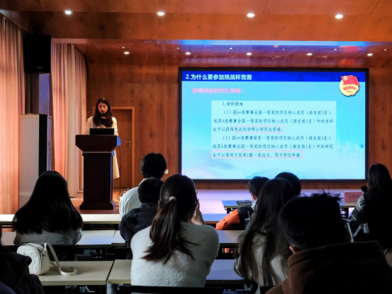挑战杯相关赛事的发展历程、赛事战况和优秀成果等内容,她先介绍了师生激励政策,接着从挑战杯的重要性、赛事层次、参赛方法、学院特点结合竞赛优势等方面提醒同学,首先要明确学院特色,了解市场空缺及政策导向;其次,要加强团队意识,充分利用学校现有的资源,发挥专业协同效应,共同打磨参赛作品;最后,要敢于挑战自我,超越自我,主动寻求指导老师的帮助,要在实践过程中,克服困难,总结经验。