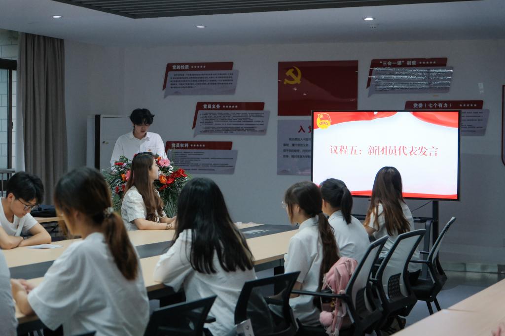 新发展团员代表傅腾坤分享入团感言,他坦言专业成绩班级第十名跃升至第二名成长足迹,每一步都凝聚着汗水和努力,也闪耀着团组织关怀的光辉,每一次的进步都离不开团组织的支持与鼓励。他表示未来将继续坚定理想信念,在新的征程上铭记历史使命,以青春之名,书写壮丽篇章共同为实现中华民族伟大复兴的中国梦而奋斗。