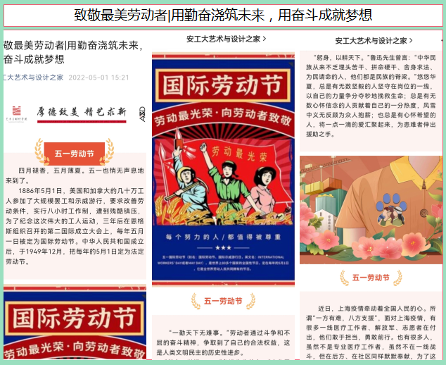 利用微信公众号平台进行劳动观念的宣传教育,发布《致敬最美劳动者|用勤奋浇筑未来,用奋斗成就梦想》,增强学生劳动观念,培养对劳动人民的感情,激发学生用奋斗成就梦想。与此同时,学院各班级开展“快乐劳动,幸福成长”劳动教育主题班会,班长领学《中共中央国务院关于全面加强新时代大中小学劳动教育的意见》,在朋辈引领中培育学生正确的劳动价值观。