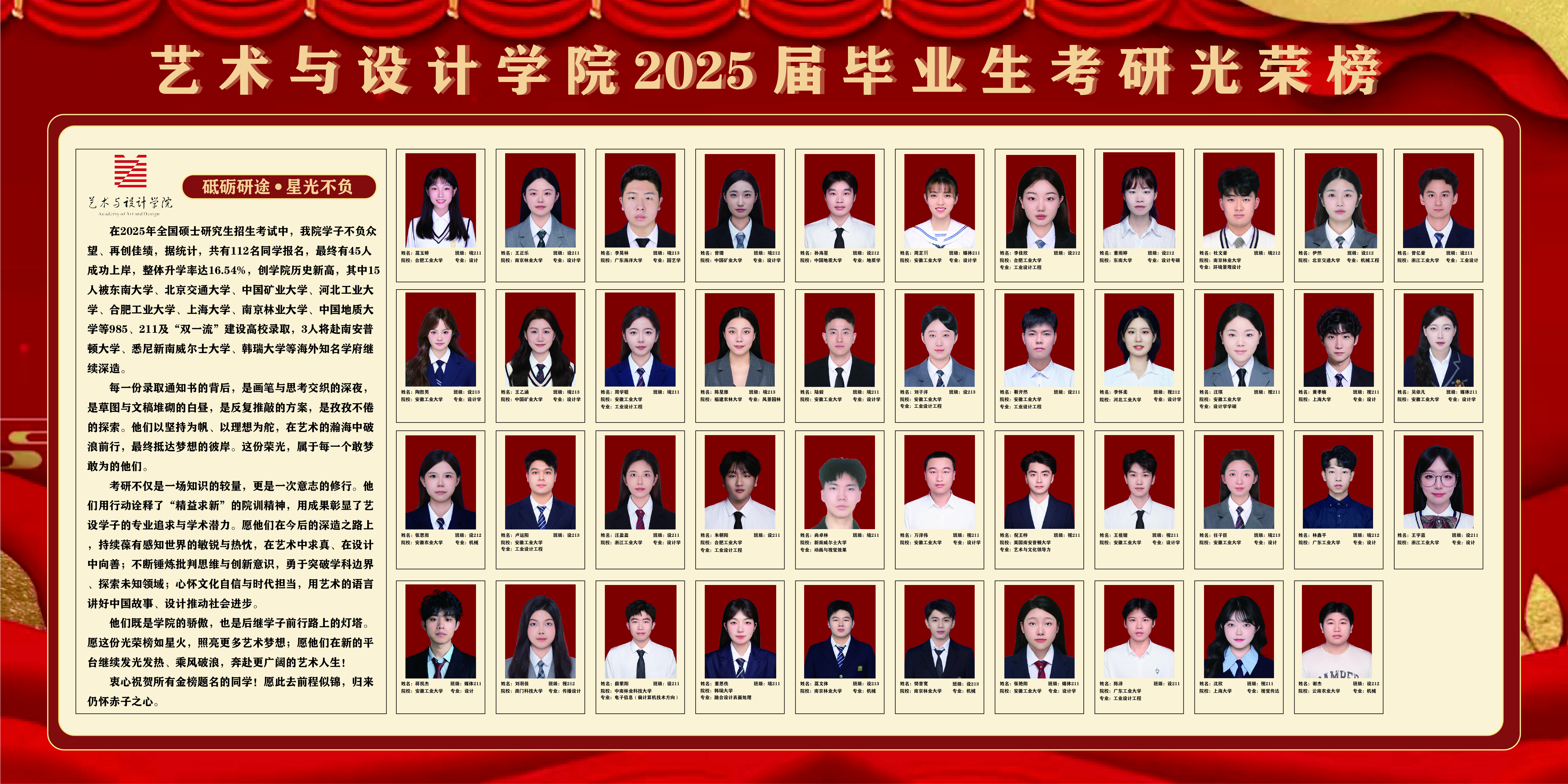 每一份录取通知书的背后,是画笔与思考交织的深夜,是草图与文稿堆砌的白昼,是反复推敲的方案,是孜孜不倦的探索。他们以坚持为帆、以理想为舵,在艺术的瀚海中破浪前行,最终抵达梦想的彼岸。