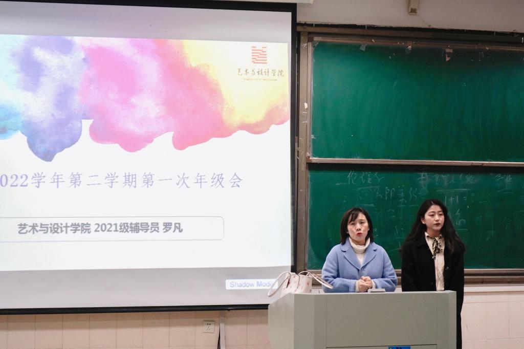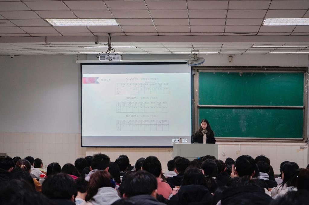 针对2021级,年级辅导员赵颖首先简要阐明工作调整,向同学们介绍2021级新辅导员罗凡,并对全体同学表达殷切期望,希望同学们珍惜四年时光。接着,年级辅导员罗凡从安全角度再次强调在校学生必须严格履行请销假制度;讲述近期校园诈骗案例,提醒同学们提高防范意识;从学业角度分析各班级成绩及年级整体学习情况,表扬优秀同学,提醒挂科同学认真复习,在新的一学期开启新的学习状态;从未来规划角度鼓励同学们坚持积累,把握学习、提升能力的机会,厚积薄发,为未来做好铺垫。