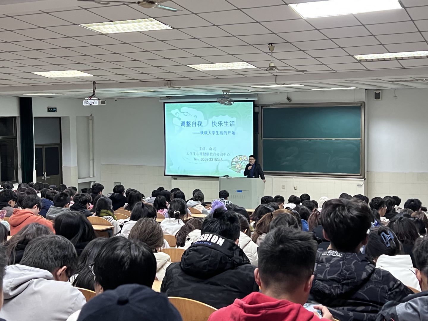 在阶教202举行心理健康教育讲座,本次讲座由新生辅导员赵颖老师主持,大学生心理健康教育咨询中心俞超老师主讲,艺设学院2021级全体同学聆听讲座。