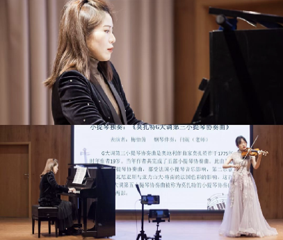 西洋乐队合奏《贝多芬第一交响曲 第二乐章》正式拉开序幕。此曲音乐旋律轻快悠扬,此起彼伏、相互交融的和声效果获得观众的阵阵掌声。随后,来自本院大四的梅怡茵同学演奏小提琴曲《莫扎特G大调第三小提琴协奏曲 第一乐章》不仅展现了小提琴演奏的高超技艺,同时表达了对古典音乐的无限热爱。紧接着,钢琴四手联弹《D大调卡农》、单簧管长笛二重奏《利兹与青鸟》、单簧管独奏《单簧管波尔卡》、钢琴独奏《Sincerely》吉他弹奏《流行的云》等节目轮番登场,异彩纷呈。