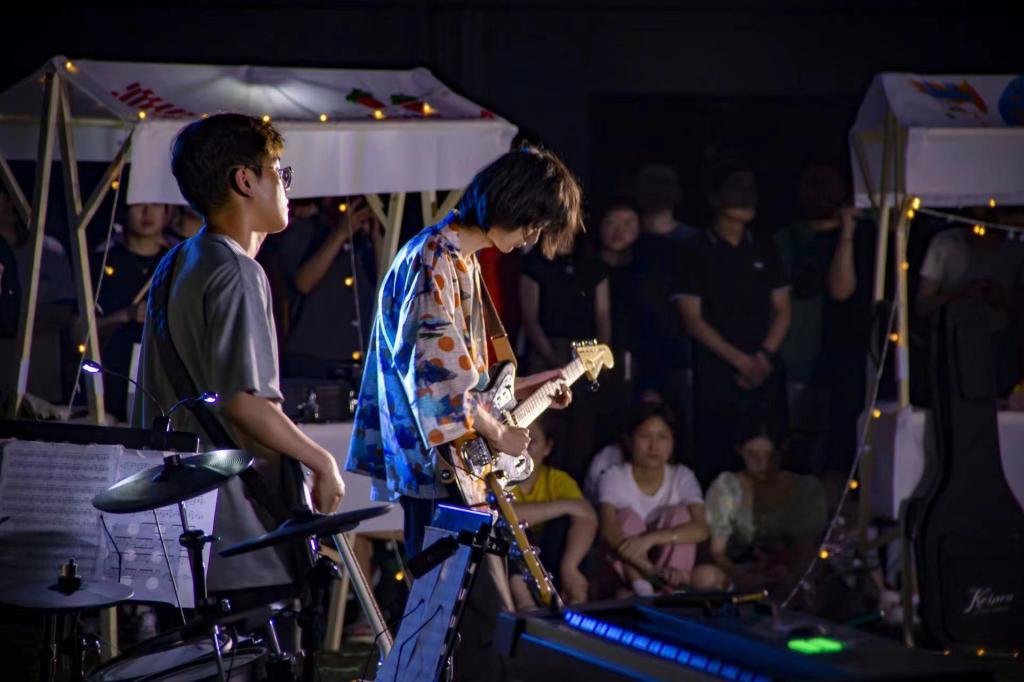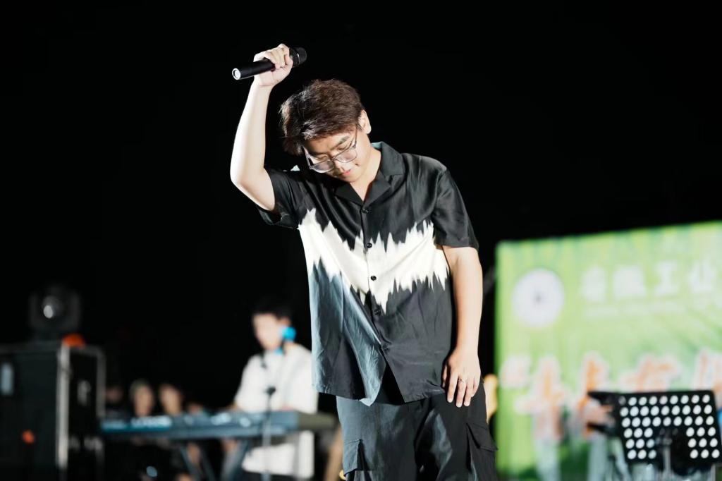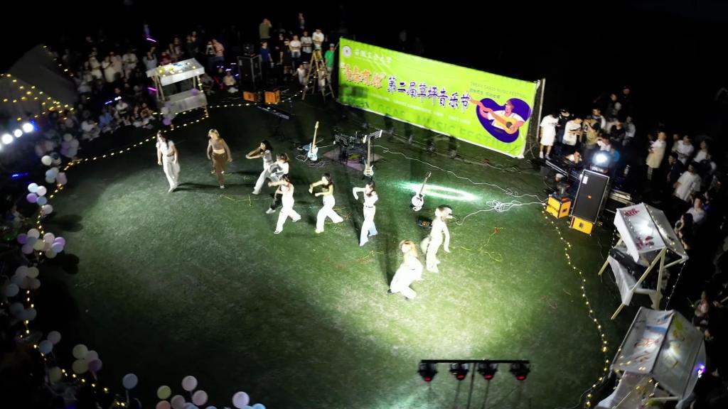光影交错之中,天际的帷幕也被缓缓拉下,18时许,音乐节正式开始…在主持人的介绍下,来自时舞社编排的《九边型战士》登上了舞台,舞动着她们火一般的热情,以高频的节奏旋律带动大家,让现场的热情氛围不断攀升。逝光乐队带来的《let it be》、《21 guns》、《夜空中最亮的星》、《一如往常》、《山海》奏响了青春的乐章,用音乐点燃了整个星空。宽仔的原创个人说唱绽放青春的活力与魅力,引起观众的阵阵尖叫与呼喊声。随着演出的升温,也吸引来了一波波前来观赏的观众,有举着荧光棒伴随歌舞挥动的大学生,有前来一睹青春活力的老师们,也有憧憬着长大以后也能如同哥哥姐姐一样舞动歌唱的小朋友…来自个人与组合的歌唱也是声声入耳,拥有着来自个人的与众不同的魅力,灯海簇拥,人生鼎沸,感受着脉搏与音乐同频生长,燥热也未能影响全场的炸裂氛围。音乐节在逝光乐队的《drain you》中落下帷幕。
