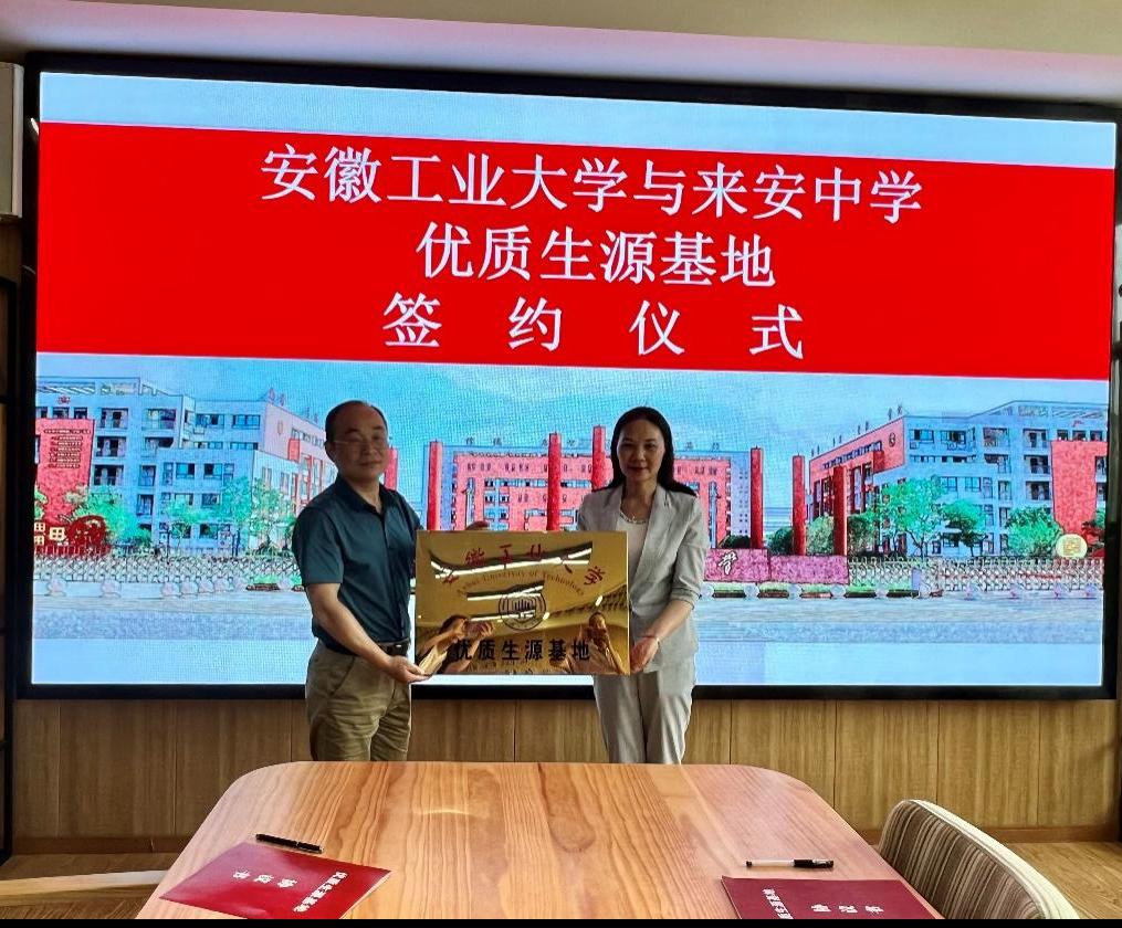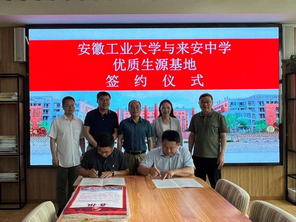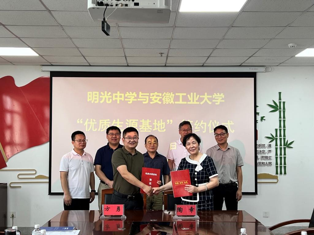 方勇与来安中学和明光中学负责人在优质生源基地建设合作协议上签字。徐宏代表学校向来安中学和明光中学授予了“优质生源基地”牌匾。(撰稿:秦艳秋 审核:罗凡 汪正 方勇)