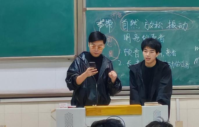 大学生美育教研室张浩霆老师的《流行歌曲演唱》观摩课现场。课程寓教于乐,妙趣横生,从简单的发声练习开始,直观展示发声器官的状态,现场引导学生做基本发声练习,并逐一进行点评,课程在轻松活泼的气氛中结束。