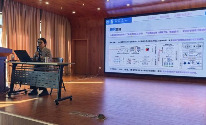 讲座伊始,张新新副教授围绕自身核心研究领域展开详细介绍。她长期致力于情感认知与计算(工业设计理论及方法)、产品情感设计(感性工学、智能设计)、文化符号再设计等方向的研究,凭借扎实的理论功底与丰富的实践经验,在相关领域形成了独具特色的研究体系。通过清晰的逻辑梳理与生动的案例阐释,张教授向在场师生系统展现了产品情感设计在新时代工业设计中的核心价值,以及跨学科融合背景下该领域的发展趋势,为师生们拓宽了学术视野。