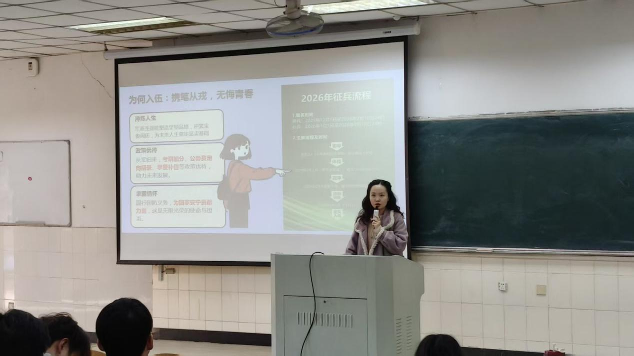 毕业班辅导员秦艳秋开展“从军报国:青春荣耀”征兵政策宣讲。她阐述了大学生入伍的重要意义与光荣使命,详细解读国家相关优待政策、入伍条件、报名流程及发展前景,为有意投身军旅的学生提供清晰指导。她还围绕体质健康测试、考研慰问、就业信息登记及第二课堂学分落实等具体事项作了安排