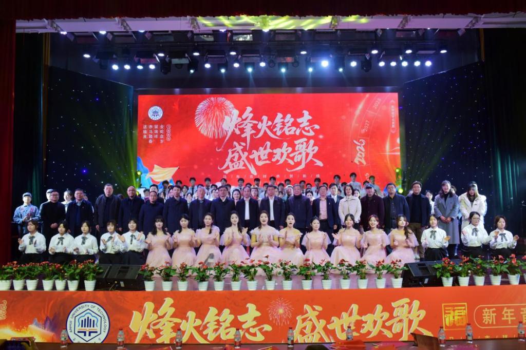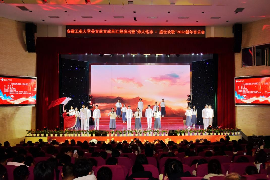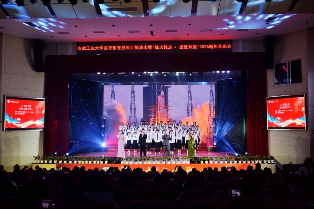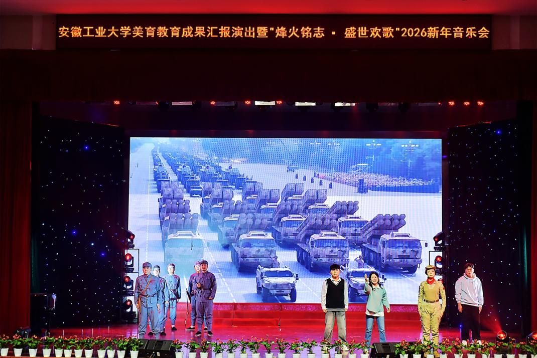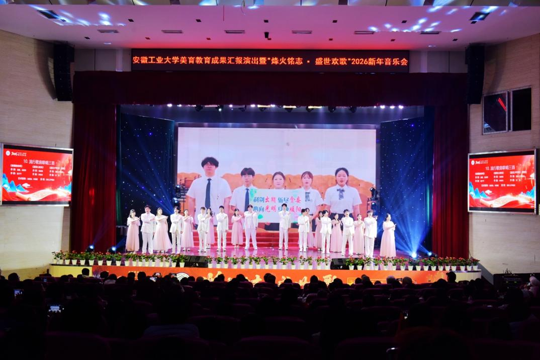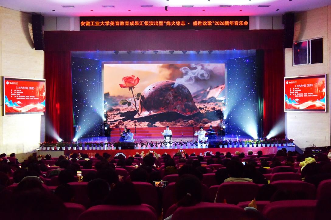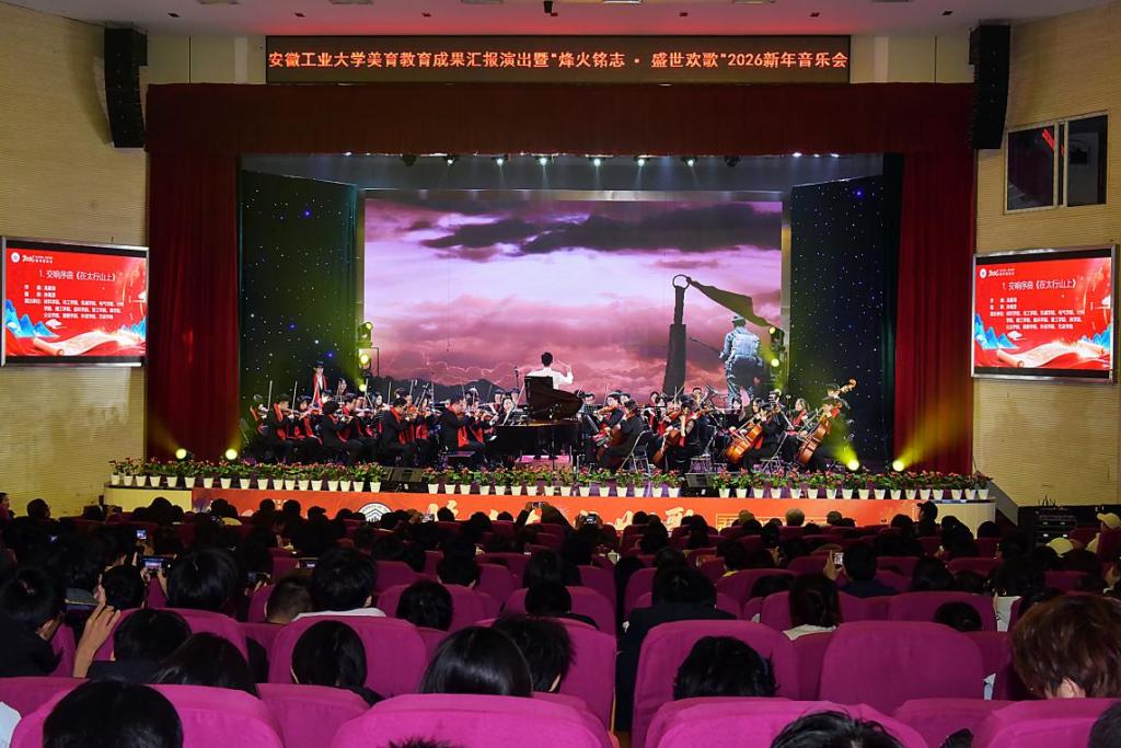 美育教育成果汇报演出暨“烽火铭志·盛世欢歌”2026新年音乐会在秀山校区新大学生活动中心浓情上演。校领导曾杰、王俊、郑啸、吴春雷、闵凡飞、郑利平、张世宏出席,校党委常委,相关职能部门、学院党政负责人、马鞍山市公安局相关负责人、兄弟学校音乐协会嘉宾、美育共建单位与优质生源基地中学代表以及师生代表共同观看音乐会。
