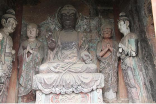 同学们第一站来到麦积山,被麦积山石窟的生动艺术深深吸引,感受到泥塑艺术的精湛,强烈的民族意识和世俗化的趋向,体现了外来艺术本土化的过程。麦积山的塑像始建于后秦(384年―417年),大兴于北魏明元帝、太武帝时,孝文帝太和元年(477年)后又有所发展。这里的泥塑大致可以分为突出墙面的高浮塑、完全离开墙面的圆塑,粘贴在墙面上的模制影塑和壁塑四类,反映了中国泥塑艺术的发展和演变过程。