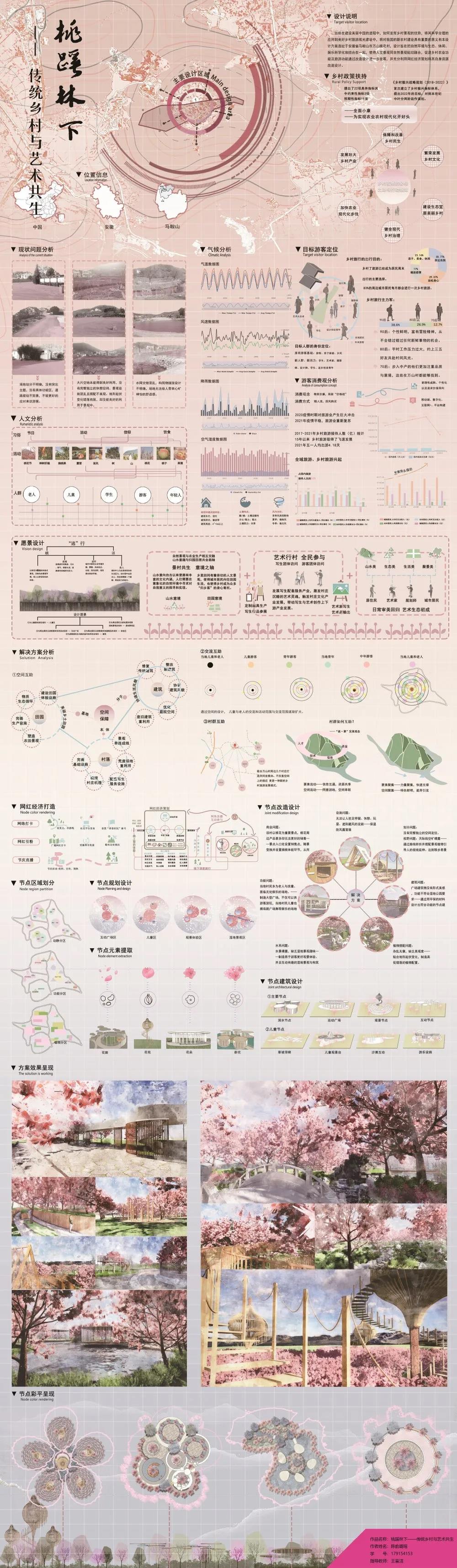 设计说明:本方案选址于马鞍山市万山桃花村,设计旨在把自然环境与生态、休闲、娱乐科学化地结合在一起,使得人文景观同自然景观贴切融合,且充分利用网红经济策划进行改造设计,促进乡村旅游功能通过改造设计进一步发展。