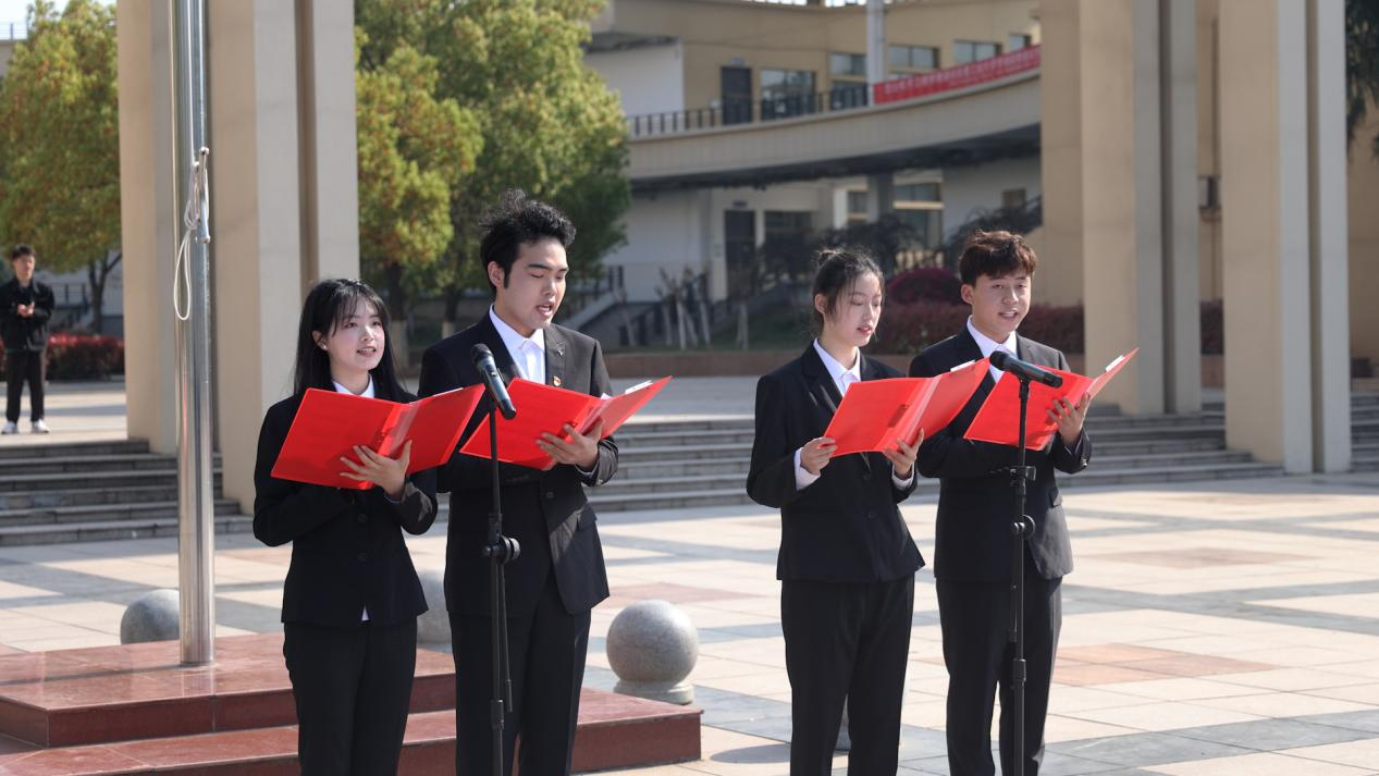 随后,学生代表与全校师生再次共同学习党的二十大报告,朗诵习近平总书记在报告中对青年的殷切期望:“广大青年要坚定不移听党话、跟党走,怀抱梦想又脚踏实地,敢想敢为又善作善成,立志做有理想、敢担当、能吃苦、肯奋斗的新时代好青年,让青春在全面建设社会主义现代化国家的火热实践中绽放绚丽之花。”在庄严的国旗下,青年学子们目光炯炯、意气风发,认真聆听寄语。