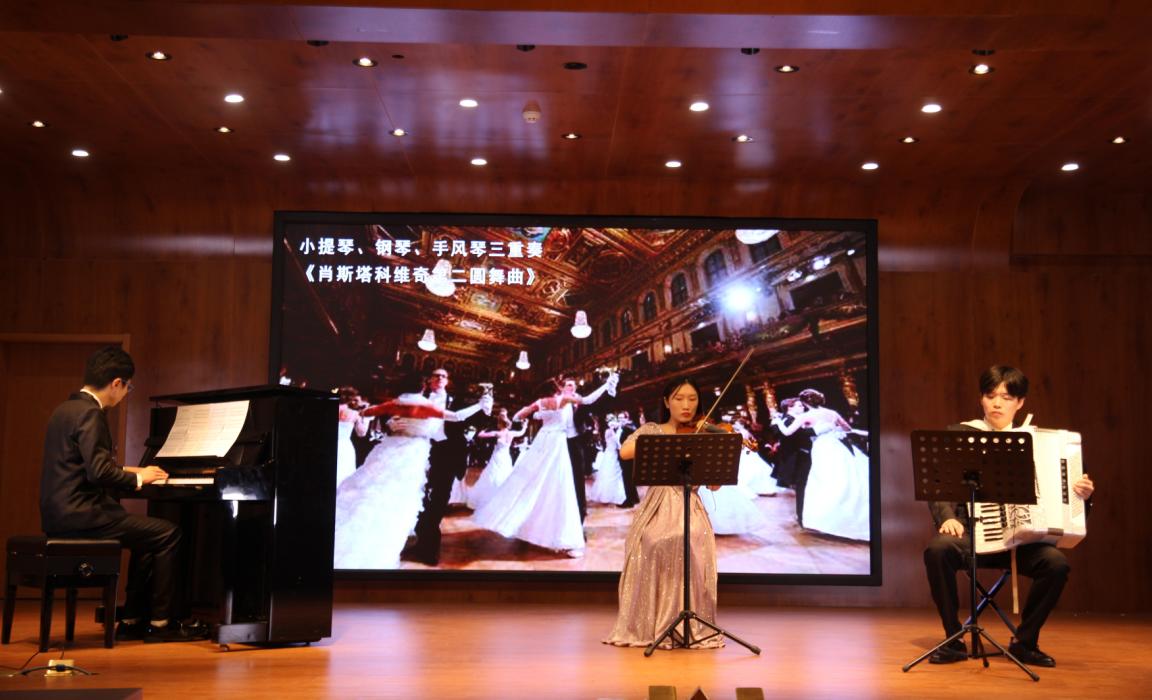 在《渔舟唱晚》那清耳悦心的古筝声中,本次听赏会缓缓拉开了帷幕,其声轻柔舒缓,描绘了渔民载歌而归之景,仿若夕阳映照浮光跃金。《雪山春晓》和《茉莉芬芳》则或灵动欢快,或婉转悠扬,观众们沉浸其中,如痴如醉。随后带来的小提琴独奏《圣母颂》与《a小调小提琴协奏曲》,前者曲调优美明朗;后者则旋律清新,描绘着严谨壮丽的音乐之美。在情感热烈高昂的钢琴独奏《辉煌的大圆舞曲》和《革命练习曲》中,听赏会气氛走向高潮。手风琴独奏《lemon》与《查尔达什舞曲》则展现了新潮与古典的碰撞,精彩动人的演奏赢得在场观众掌声阵阵。最后在乐器三重奏《第二圆舞曲》华丽欢快的旋律中,本次听赏会走向尾声。嘉宾与演奏者合影留念,听赏会圆满结束。