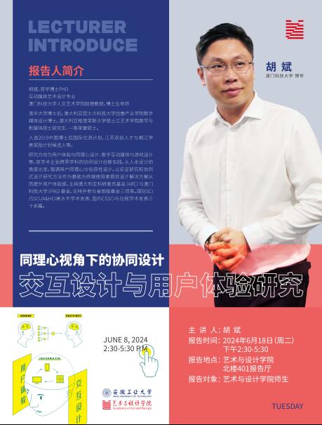 胡斌,哲学博士PhD,互动媒体艺术设计专业。澳门科技大学人文艺术学院助理教授,博士生导师。清华大学博士后,澳大利亚昆士兰科技大学创意产业学院数字媒体设计博士,澳大利亚格里菲斯大学昆士兰艺术学院数字与新媒体硕士研究生、一等荣誉硕士。入选2019中国博士后国际交流计划,江苏双创人才与桐江学者奖励计划候选人等。研究方向为用户体验与同理心设计、数字互动媒体与游戏设计等,其学术主张跨界学科的协同设计创新实践,从人本设计的角度出发,强调用户同理心与包容性设计,以实证研究和协同式设计研究方法作为基础为终端使用者提供设计解决方案从而提升用户体验感。主持澳大利亚科研委员基金(ARC)与澳门科技大学(FRG)基金,主持并参与省部级基金三项等。国际SCI/SSCI/A&HCI高水平学术发表、国内CSSCI与北核学术发表三十余篇。
