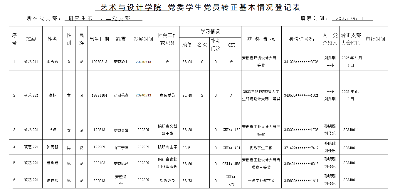 经党支部研究,拟吸收孙宪智、陈俊哲、张迪、桂昕翔、秦扬、李秀秀等六名同志为中共正式党员,现将他们的有关情况予以公示,欢迎广大党员、干部、群众通过信函、电话或直接到党支部或上级党组织反映公示对象的思想品质、现实表现、廉洁自律、培养教育等方面情况。