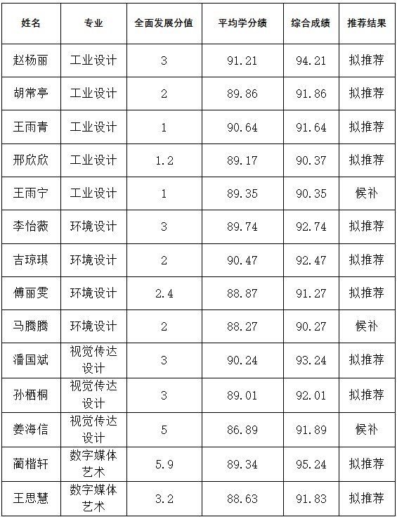 推荐优秀应届本科毕业生免试攻读研究生工作实施办法》《艺术与设计学院2026年推荐优秀应届本科毕业生免试攻读硕士学位研究生遴选工作实施细则》,经个人申请,院内答辩专家认定,学院推免生遴选工作小组复核,学院党委会、党政联席会通过,确定以下11名同学为艺术与设计学院免试攻读研究生拟推荐人选。同时公示3名候补人员,拟推荐人员如有放弃或其他不符合推免资格者按《草莓视频